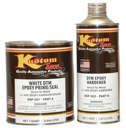 1 Quart Kit of WHITE DTM (Direct to Metal) EPOXY PRIMER SURFACER & SEALER KIT INCLUDES: 1 Quart of KEP507 WHITE DTM EPOXY PRIMER, 1 Pint of KEP502 DTM PRIMER HARDENER. Contents must be mixed thoroughly. Do not mix more material than can be used in one application. No induction time is required. DTM Epoxy Prime / Seal is an excellent corrosion resistant primer that offers optimum adhesion and superior hide to many types of properly prepared metal, aluminum, fiberglass and plastic filling materials. DTM Epoxy Prime / Seal, is easy to sand and topcoat with all current base coats. It can be used as a sealer and applied wet-on-wet when reduced with KR100 Universal Compliant Retarder. DTM Epoxy Prime / Seal is chromate free.