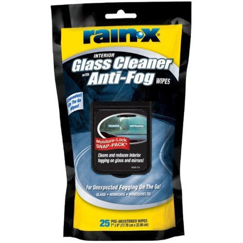 Rain-X 5077368 Glass Cleaner with Antifog Wipes - pack of 25 (Replaces 68030). Moisture-Lock Snap Pack keeps wipes from drying out. Cleaners, reduces interior fogging and removes smoke residue. Fits in glove compartment or door panel or under seat. For use on interior mirrors and glass.